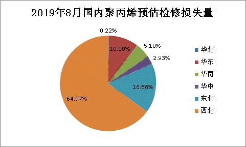 ????????由上圖可以看出,未來8月份國內(nèi)聚丙烯檢修裝置主要集中在西北、東北和華東地區(qū),西南地區(qū)暫無裝置檢修。西北地區(qū)檢修裝置主要有獨山子石化、延安能源化工、神華榆林和神華新疆等;東北地區(qū)大慶煉化雙線8月份按計劃檢修;華東地區(qū)常州富德常停裝置短期內(nèi)未有重啟計劃。