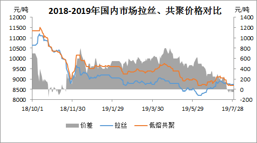 ????????進入7月份以來,隨著PP期貨的大幅拉漲,作為標(biāo)品的PP拉絲跟漲迅速,作為非標(biāo)品的共聚,漲幅跟進較為緩慢,國內(nèi)聚丙烯現(xiàn)貨市場拉絲與共聚市場價格出現(xiàn)平水的現(xiàn)象,從2016年至今拉絲與共聚平水的現(xiàn)象僅出現(xiàn)過兩次,目前已經(jīng)進入倒掛態(tài)勢,拉絲價格高出共聚300元/噸之多。